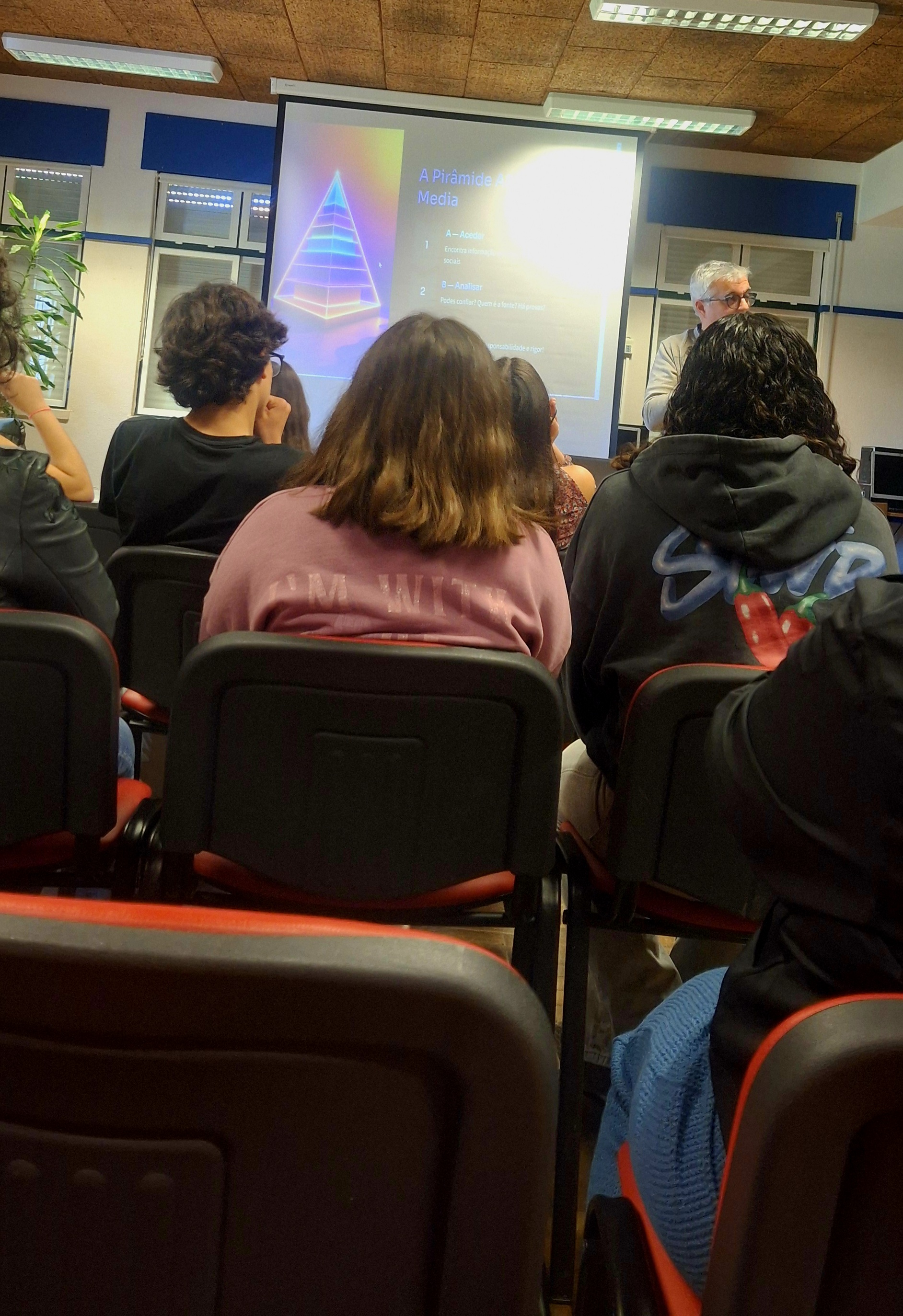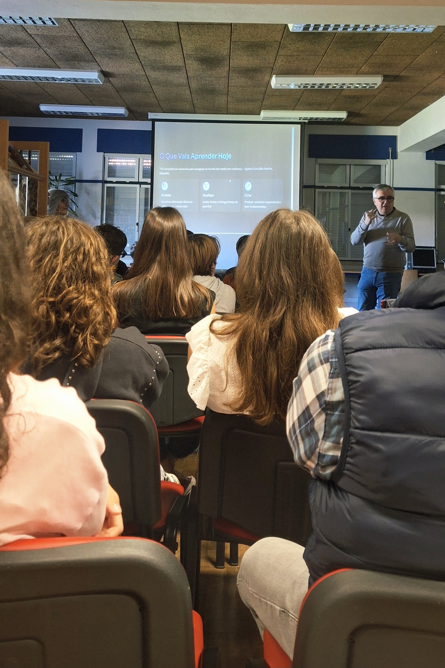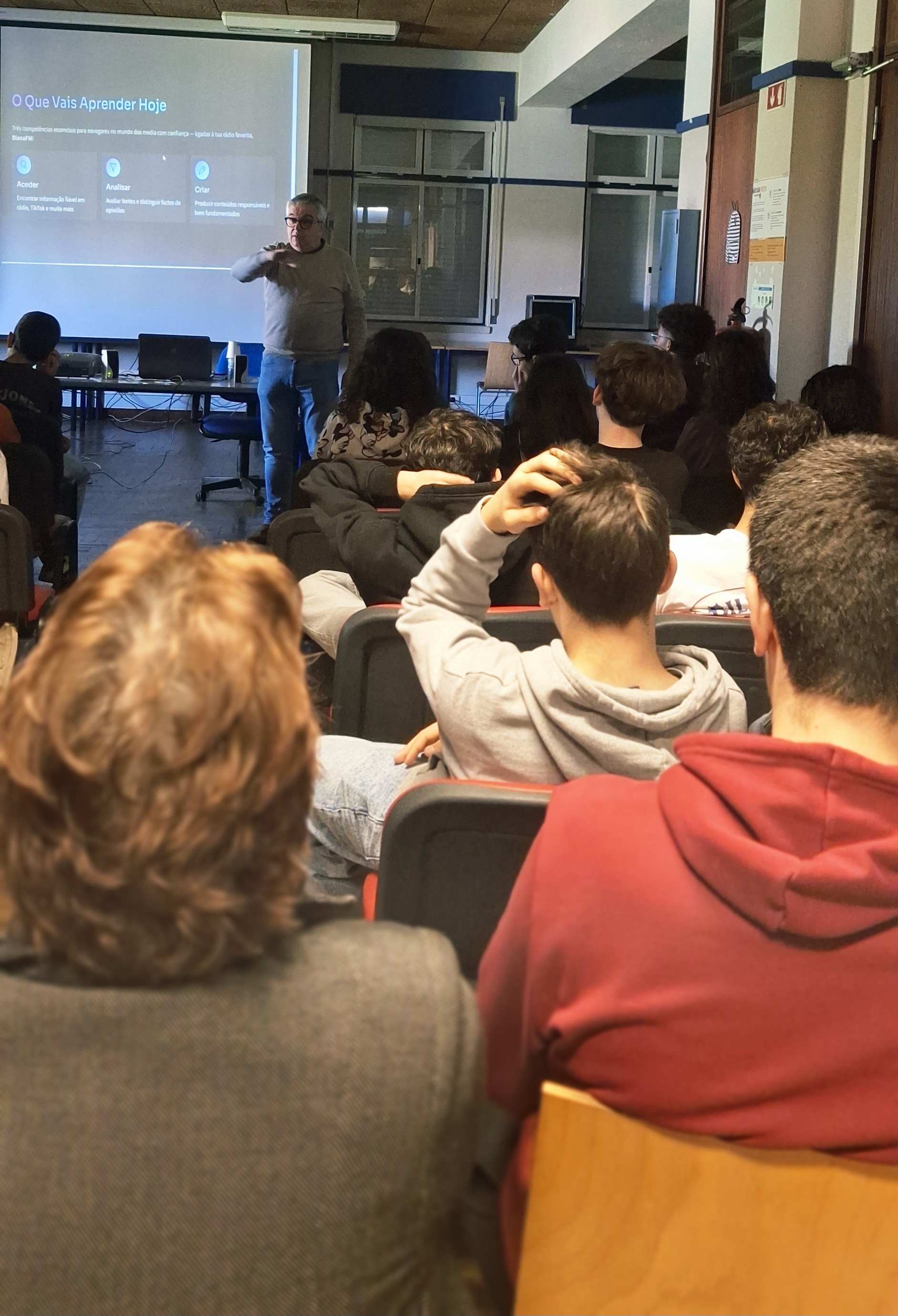 Dia 24 de março, os alunos participaram numa sessão dinamizada pela Rádio DianaFM, onde o foco foi o combate à desinformação. Através de desafios práticos, aprenderam a identificar conteúdos manipulados e a avaliar a veracidade de notícias que circulam nas redes sociais. Mais do que uma aula, foi um exercício de espírito crítico aplicado ao quotidiano digital dos jovens.